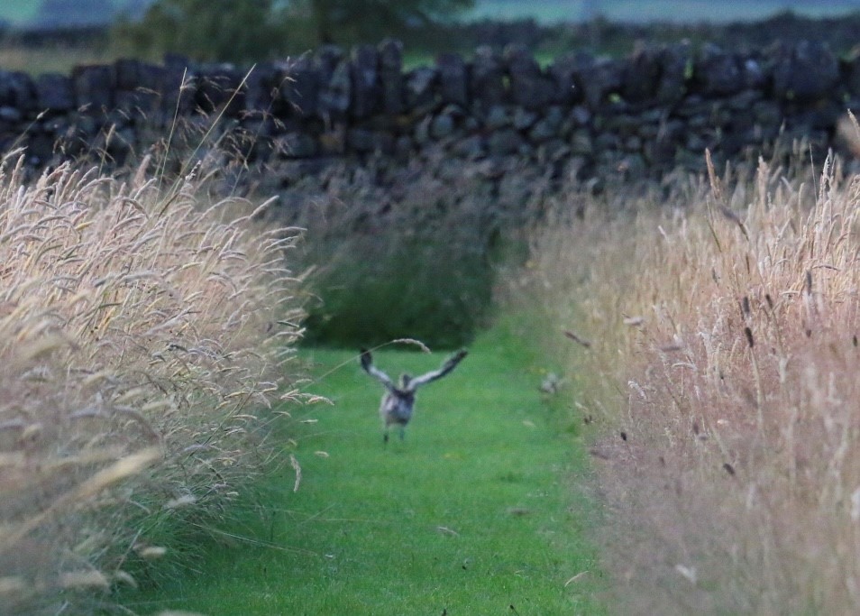 The chicks would be tiny and the grass was long. Spotting them would be impossible and proved to be so. From the behaviour of the adults, we guessed the chicks were near a wall at the northern end of the field and let Adam know to drive carefully in that part of the field. We still had no plan! But Friedy got the bit between her teeth and set off after the tractor during its first pass in that part of the field.